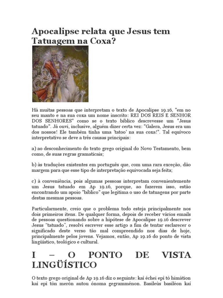 A passagem do Apocalipse 1911-21 fala do primeiro combate escatológico do fim dos tempos. Rei dos reis e Senhor dos senhores. Em Apocalipse 1916 se diz que Jesus tem uma tatuagem na sua perna ou no manto. Apocalipse 1916-21 No manto sobre a sua coxa tem escrito o nome. E Ele mesmo é o que pisa o lagar do vinho da justa ira de Deus Todo-Poderoso. Em seu manto e em sua coxa está escrito este nome. Isso indica a associação à potência particular desta parte do corpo e invoca a descendência. Em contrapartida existem aqueles que dizem que o Senhor aprova a tatuagem até mesmo porque em Apocalipse encontramos um texto que afirma que Jesus tinha tatuado na coxa a expressão. Na Bíblia temos por exemplo o costume de fazer um juramento colocando a mão embaixo da coxa do outro Gênesis 243-4. Além do mais pressinto que já temos alguns membros sendo atraídos por essa ideia pensando em tatuar um verso bíblico uma palavra hebraica ou uma imagem do Cavaleiro no Cavalo Branco de Apocalipse 19 que tinha escrito em sua coxa. No manto sobre a sua coxa tem escrito o nome. No manto sobre a sua coxa tem escrito o nome. Apocalipse 19 16 em sua coxa estava ecreito tatuagem.