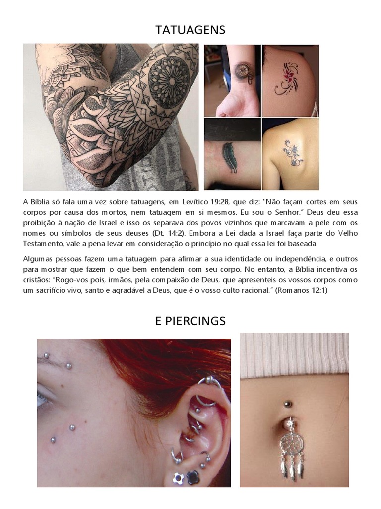 A vontade de fazer uma tatuagem veio cedo já no final da adolescência porém meus pais nunca foram muito adeptos da ideia o que nos leva desde já ao primeiro ponto. Ao todo foram analisados 257 artigos posteriormente divididos em seis categorias temáticas sendo 88 deles sobre comportamento de risco 78 sobre motivações para realização das tatuagens 15 sobre características de personalidade 7 sobre arrependimento 34 investigam tatuagem sobre o olhar da psicologia social e outros 35 foram categorizados na categoria outros. Analise teológica sobre tatuagem Eu sou o SENHOR para justificar a ideia de que a Bíblia condena a utilização de tatuagens. Há quem use o texto de Levítico 1928. Hoje pela manhã 060914 estive ministrando para os jovens de nossa congregação e um deles me falou sobre um vídeo do bispo Rodovalho sobre a tatuagem. As marcas referidas nesse texto estão ligadas a cultos pagãos. - Sobre a história da tatuagem analise as afirmações e marque duas opções corretas. Mas esse registro não é feito sobre um elemento material qualquer talvez de vida curta como o papel - mas é realizado sobre a pele do corpo. No v20 o Senhor declara. Aquele que pecar é que morrerá. Se o símbolo se identificar completamente com aquilo.