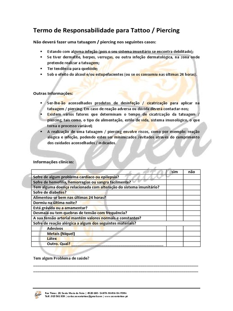 Seven Tattoo Termo De Responsabilidade Para Tattoo Ou Piercing Pdf Tatuagem Gravidez
